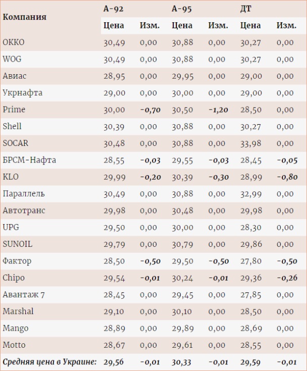 У мережі KLO ціни на бензин знизилися на 20-30 коп./л: бензин марки А-92 подешевшав до 29,99 грн/л, А-95 - до 30,39 грн/л. Водночас ДП подешевшало на 80 коп./л - до 28,99 грн/л. Мережа "Фактор" знизила ціни на всі види пального на 50 коп./л.