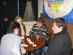 - В Україні є громадська організація «Ліга українських клубів («ЛУК») Що? Де? Коли?». Ми до нього теж входимо як асоційований член; в нас є регіональний представник. Всі ці турніри проводимо під егідою «ЛУК». Можна заробляти кошти своїм розумом, якщо писати запитання. Їх відправляють у центральне управління «ЛУК» в м. Київ, далі їх розглядає комісія. Якщо запитання визнаються «гральними», їх розігрують на іншому турнірі. Сьогодні ми граємо синхронний Всеукраїнський турнір. Оплачується проїзд регіонального представника, який зачитує запитання, витрати. Залишки суми розділяються на кількість запитань. Автори їх і отримують грошові винагороди. Зазвичай це - від 2 до 10 доларів, в залежності від того, скільки грошей зібрали за турнір (Цієї гри з команди збирали по 20 грн. – Авт.).
