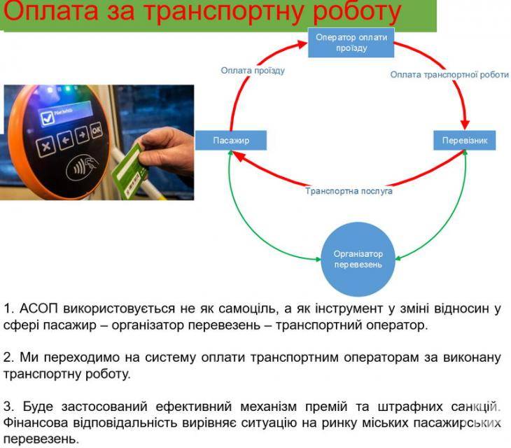 Питання оплати перевізнику. Місто бере на себе акумулювання всієї готівки з обслуговування громадським транспортом, і виплачує перевізнику певну суму за пророблену роботу (за кілометр-пробіги). Рано чи пізно місто має прийти до цивілізаційної моделі. Тобто за умови наявності нормального автобусу, який виконує графік і маршрут, перевізник отримує оплату за свою роботу.