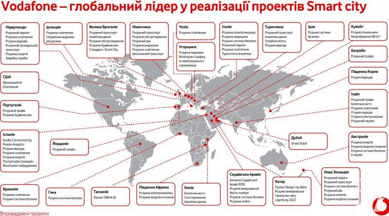 Сьогодні IoT-платформа Vodafone забезпечує 77 мільйонів підключень по всьому світу. Загалом Vodafone має близько 80 проектів на базі IoT-рішень у 27 країнах світу: від США до Південної Кореї і Нової Зеландії, від Нідерландів до Південної Африки.