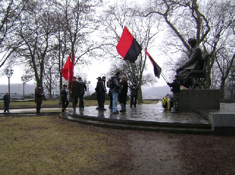 Від одного з присутніх надійшло чемне зауваження про недоречність їх висловлювань та й взагалі їх присутності біля пам’ятника Великого Українця - видатного представника Української Нації, яку комуністи ненавидять та на протязі всього часу їх панування намагалися знищити.