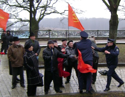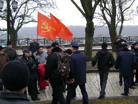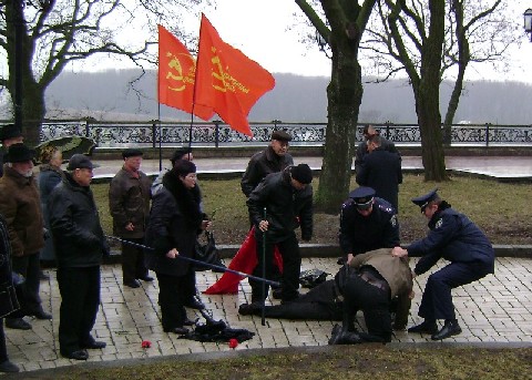 Коммунисты, в основном пожилого возраста подошли мирно и вы, осознанно сделали все, чтобы их спровоцировать. Они, а не вы читали Кобзаря перед вашим "кордоном". И били вы их - стариков, молодчики 25-30 лет. По-другому назвать вас не могу, а можно и грубее.