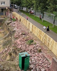 Сегодня они завалили и сам этот забор. Территория этой стройплощадки все увеличивается. Как опухоль. Она уже занимает тротуар по пр. Мира.