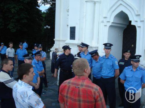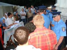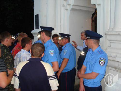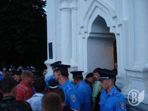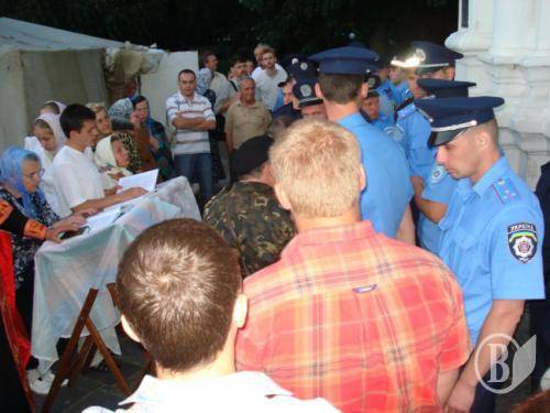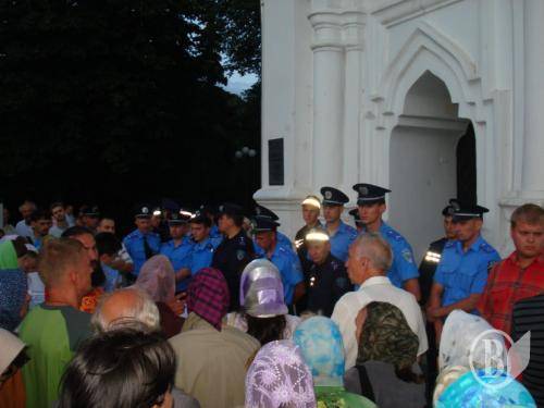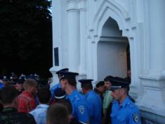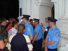 В храм пытались также попасть представители Московского патриархата, которые продолжают находиться около Екатеринки в своих импровизированных храмовых палатках. Однако, их попытку блокировали представители милиции.