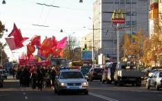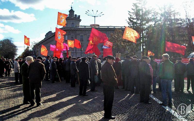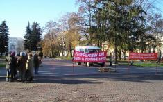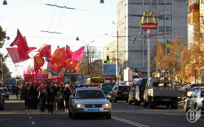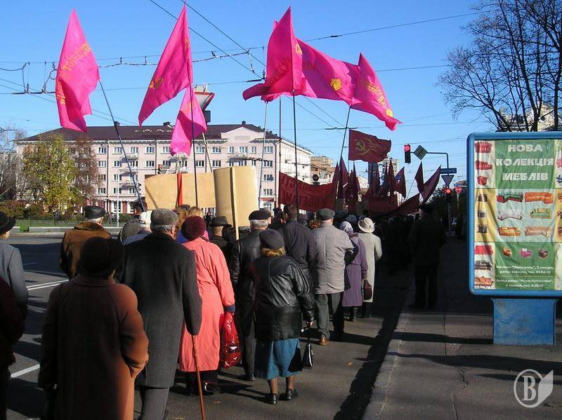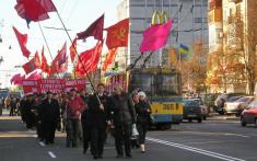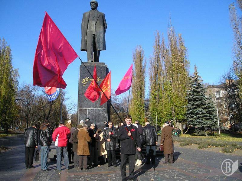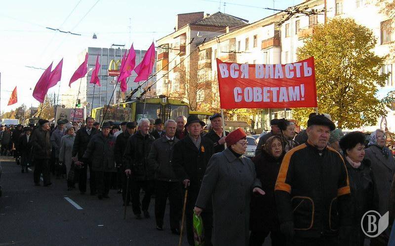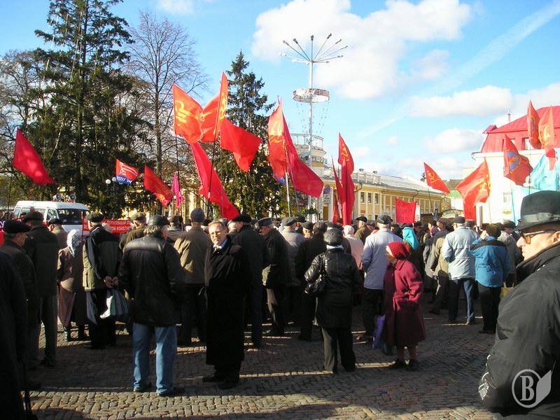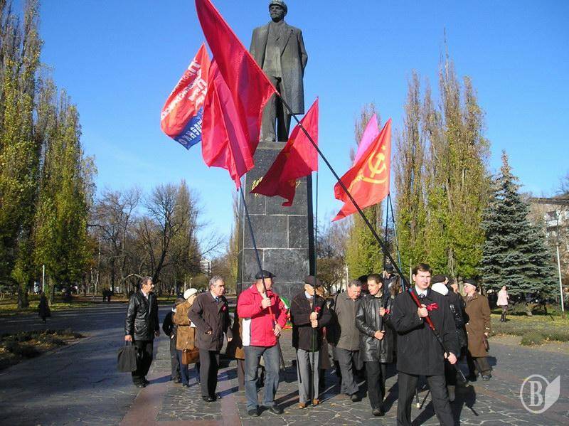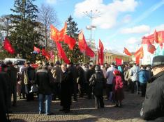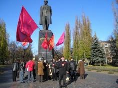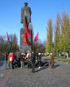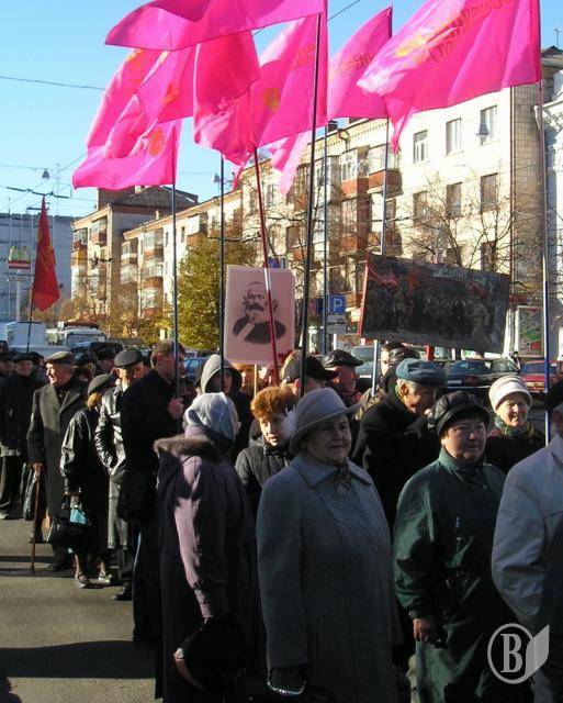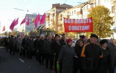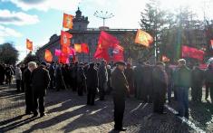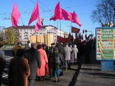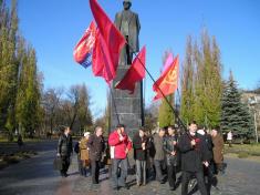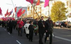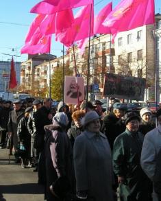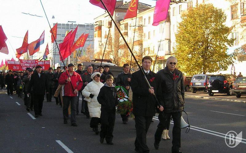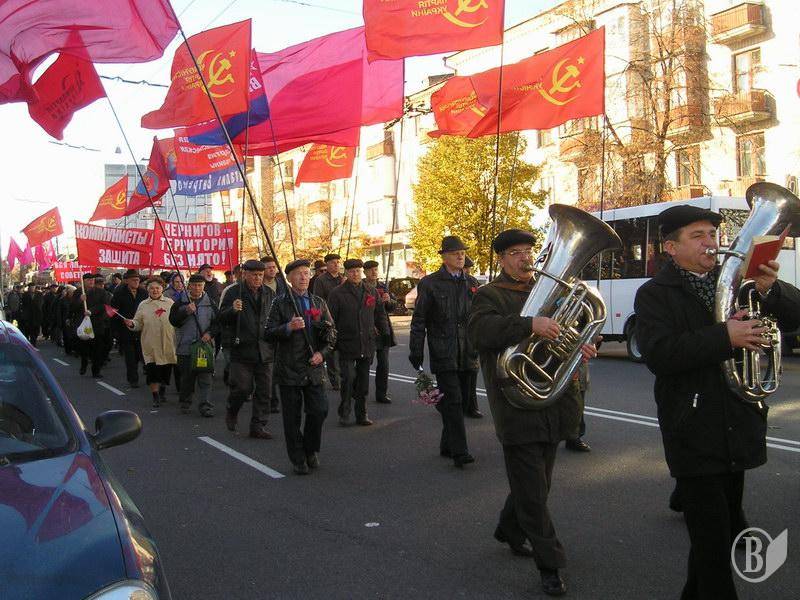 Сьогодні, у річницю жовтневого перевороту 1917 року в Санкт-Петербурзі, осередки лівих партій у Чернігові організували мітинги і ходу з прапорами - рожевими, із серпами та іншими.
