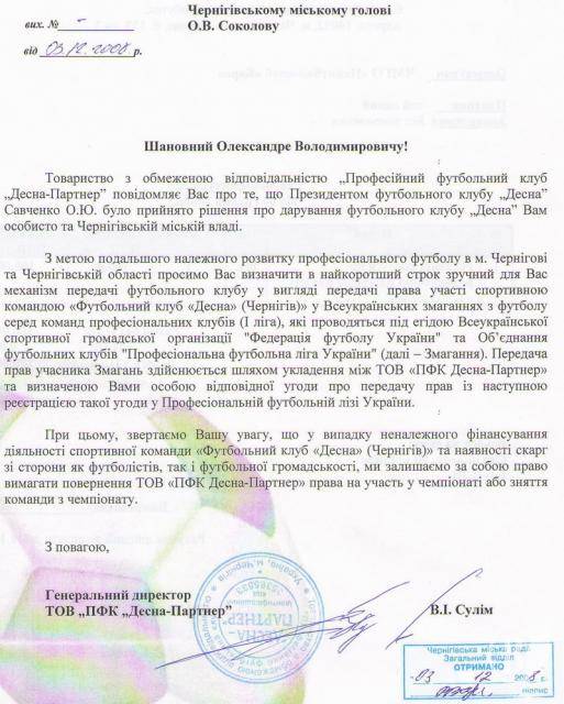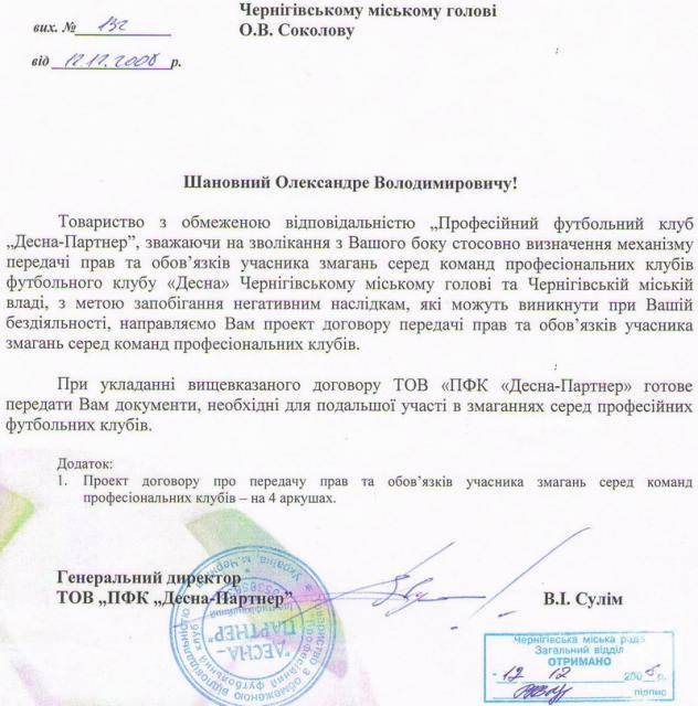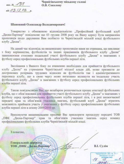 08.12.2008 года ООО „ПФК „Десна-Партнёр” по адресу Черниговского городского председателя было повторно направлено предложение принять ФК „Десна”.