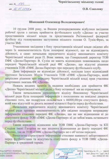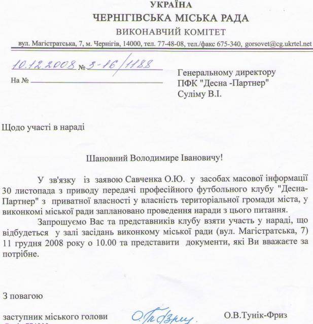 10.12.2008 года заместителем городского председателя О.В.Туник-Фриз по адресу ООО „ПФК „Десна-Партнёр” было направлено приглашение на принятие участия в совещании по вопросам принятия ФК „Десна” Черниговской городской властью.