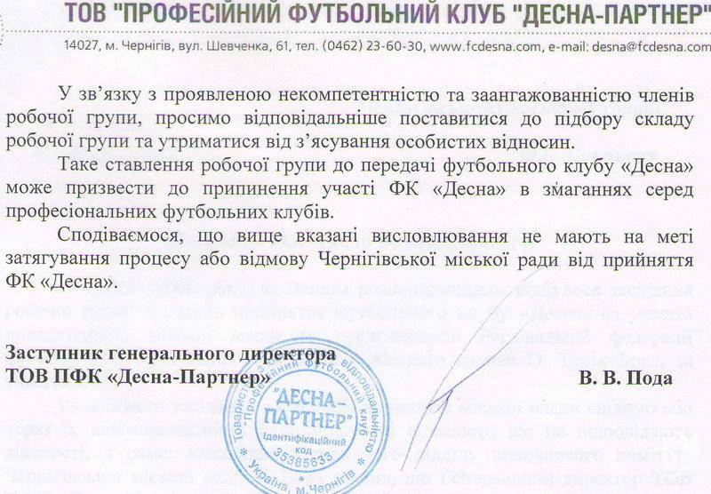 В связи с распространением представителями Черниговского городского совета неправдивой информации относительно непредоставления ООО „ПФК „Десна-Партнёр” необходимых для передачи клуба документов и существования у ООО „ПФК „Десна-Партнёр” долгов, по адресу Черниговского городского председателя было направлено письмо с просьбой опровергнуть неправдивую информацию.