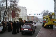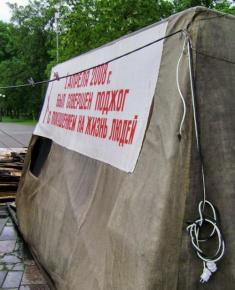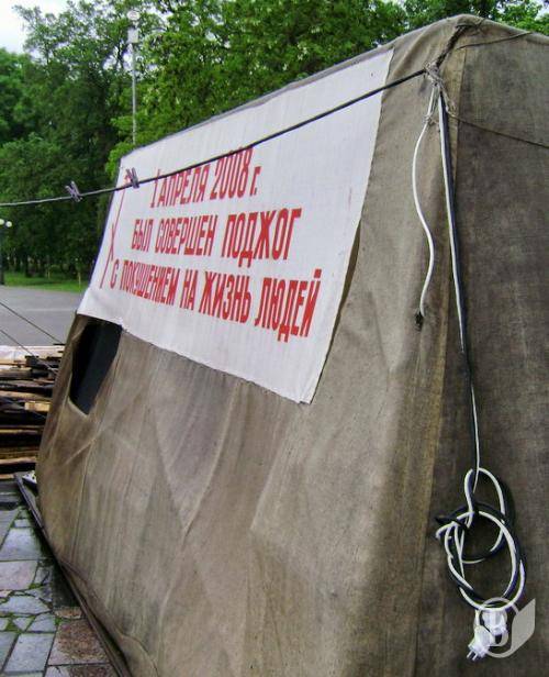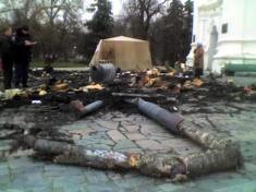 1 квітня 2008 року згорів один з наметів блокувальників. Це дало привід прихильникам УПЦ МП припускати, ніби намет підпалили, а протилежній стороні – говорити про недотримання техніки пожежної безпеки.