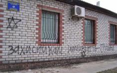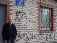 Сегодня ночью хулиганами были разрисованы стены нашего помещения. Вот вы видите, что они написали: ”Защитникам иммигрантов – позор” и вообще непонятно причём здесь еврейские звёзды? Увидели мы это утром, когда пришли на работу.