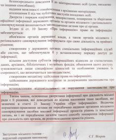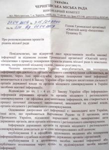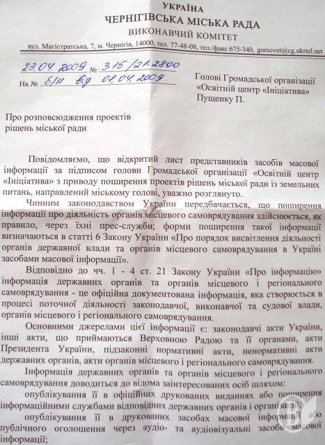 В официальном ответе, который получил Черниговский образовательный центр «Инициатива», городская власть так объясняет свою позицию: «... нормативно-правовими актами не предусмотрено предоставление органами местного самоуправления средствам массовой информации проектов решений по земельным вопросам, как и не предусмотрено в целом такого способа распространения информации о деятельности этих органов, как распространение проектов решений».