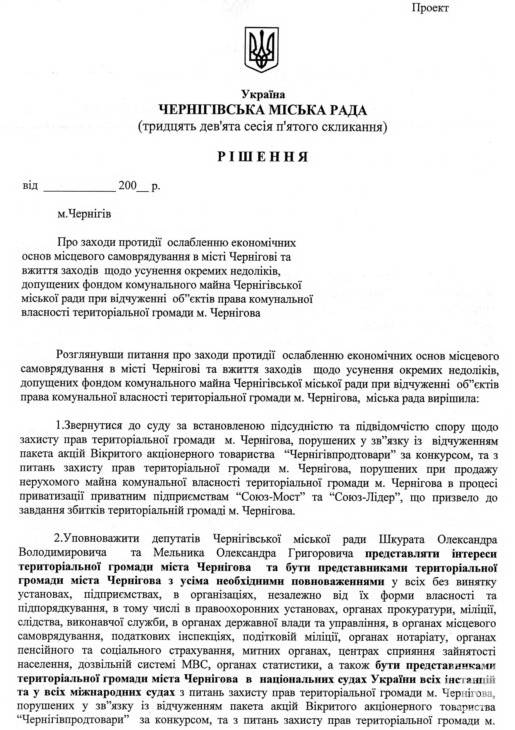 В цих умовах тимчасова комісія бачить тільки єдиний вихід – «вжити заходів до розірвання (визнання недійсним) договору купівлі-продажу пакета акцій ВАТ «Черніівпродтаовари» за конкурсом від 31.05.2005 р. укладеного між Фондом комунального майна Чернігівської міської ради та приватним підприємством «Союз–Мост».