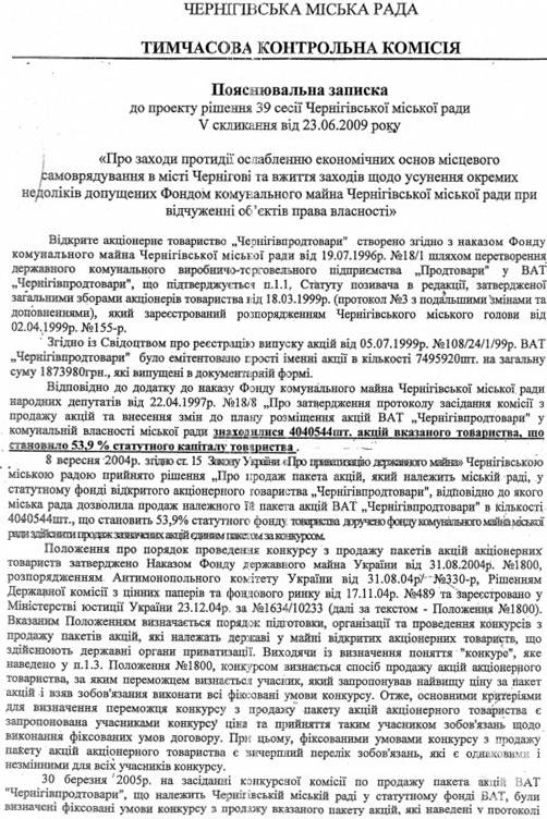 Більше того, комісією було встановлено, що в серпні 2008 року господарський суд Чернігівської області відмінив дію названих пунктів в договорі купівлі-продажу, про що не було повідомлено депутатам.