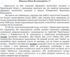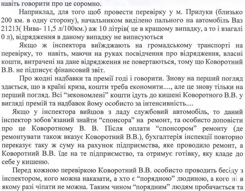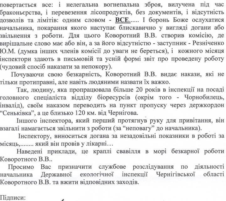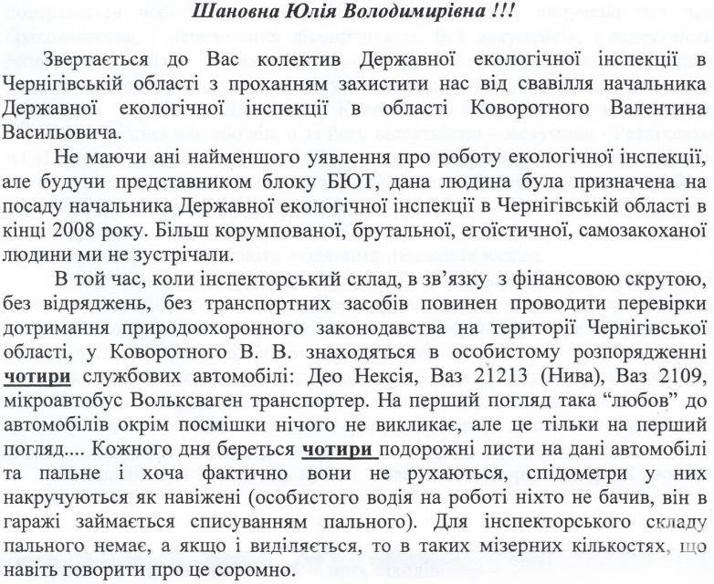 Працівники Державної екологічної інспекції у Чернігівській області (ДЕІ) направили колективного листа прем’єр-міністру Юлії Тимошенко, у якому жаліються на свого «корумпованого, брутального та самозакоханого» начальника Валентина Коворотного.