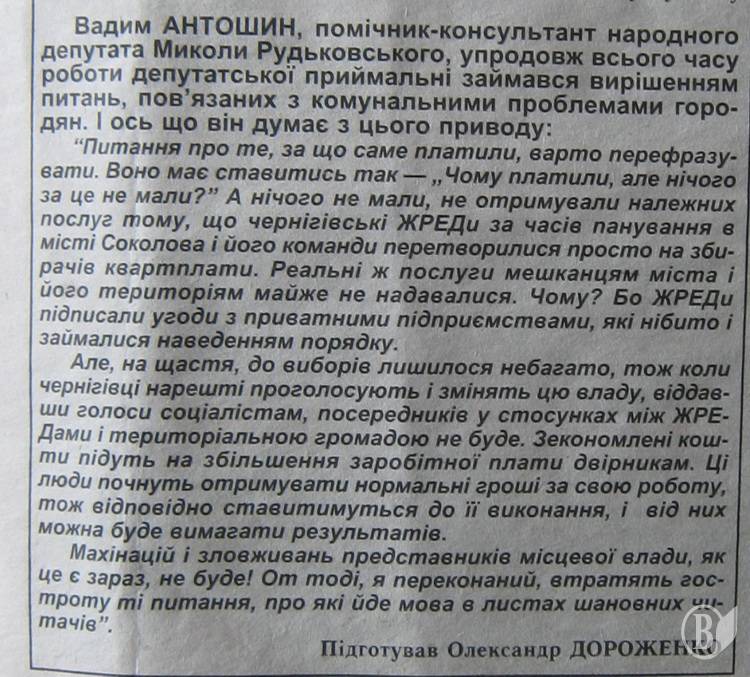 Вадим Антошин, помічник-консультант народного депутата Миколи Рудьковського, упродовж всього часу роботи депутатської приймальні займався вирішенням питань, пов'язаних з комунальними проблемами городян. Ось що він думав з цього приводу в 2006 році: