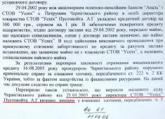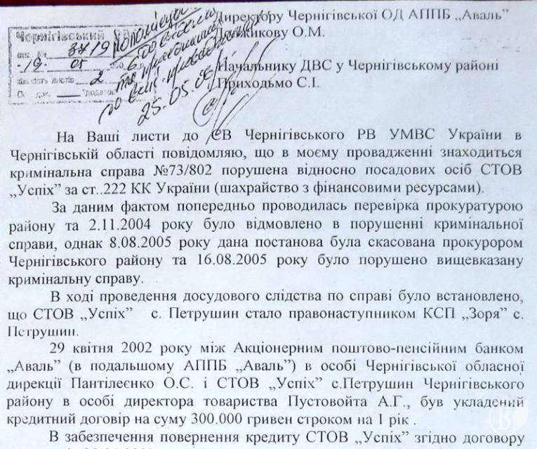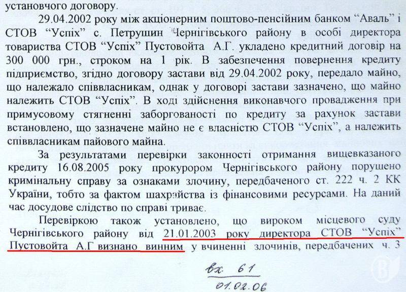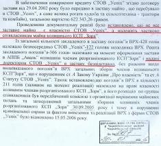 Кредит на 300 тысяч гривен, который взял бывший председатель СТОВ «Успех» Пустовойт в банке «Аваль», в кассу СТОВ не поступал. По данным Н.Артеменко, на часть тех денег была приобретена недвижимость в Херсонской области. Где же подевались остальные кредитные деньги, ему неизвестно.
