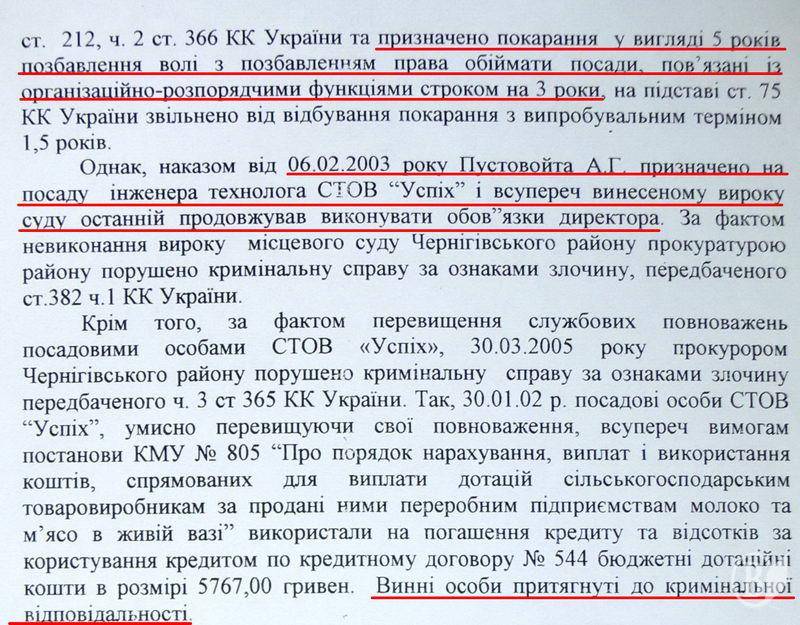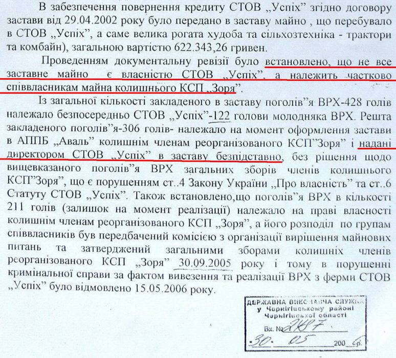 4. «Кроме того, по результатам проверок обстоятельств вывоза спорного БРС из коровников СТОВ «Успех» правоохранительные органы даже приходили к выводу, что при оформлении документов на скот в действиях должностных лиц Петрушинского сельсовета, ПП « Санта» и представителя пайщиков Артеменко Н.В. видятся признаки преступления, предусмотренного ст. 366 КК Украины (служебная подделка)». Ну это уже, извините, открытая ложь. Автор написал все верно, кроме одного, все наоборот. Как я уже писал выше, никаких признаков преступления не обнаружено. Все это подтверждается документами. Очень хотелось бы увидеть тот документ, на который ссылается автор.