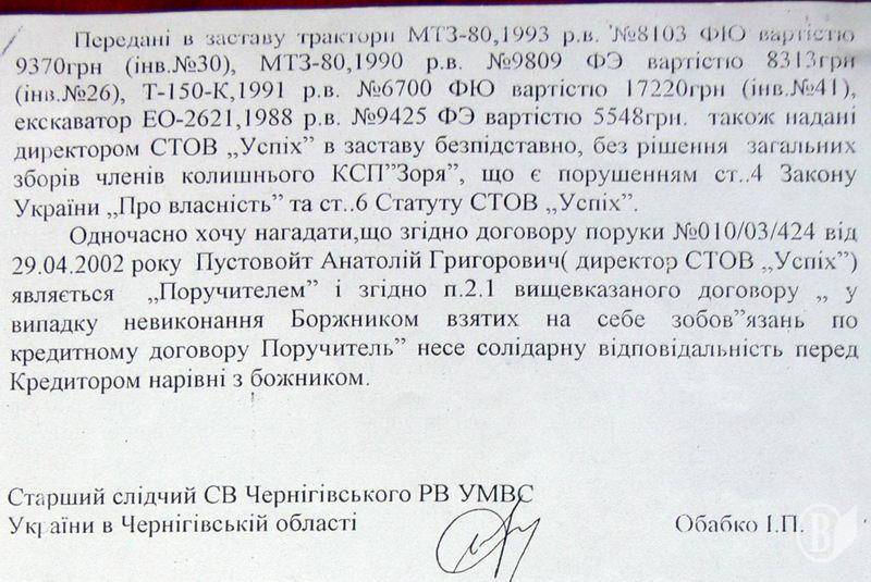 В статье неоднократно указывается, что коровы были вывезены с территории СТОВ «Успех» и из коровников СТОВ «Успех». Хочу Вам сообщить следующее, СТОВ «Успех» не имеет ни коровников, ни территории, вообще ничего. Приехал к нам Пустовойт А. Г., зарегистрировал СТОВ «Успех». Никакого имущества у него не было. Мы предоставили СТОВ «Успех» в аренду паи. А Пустовойт, мало того, что спустил все, так еще и набрал под паевое имущество кредитов.