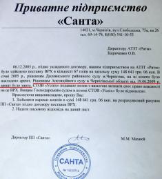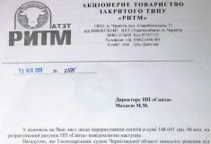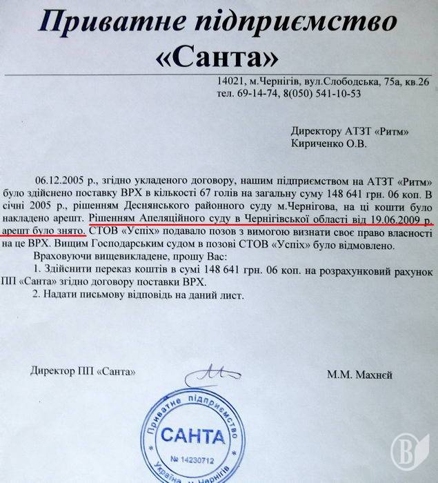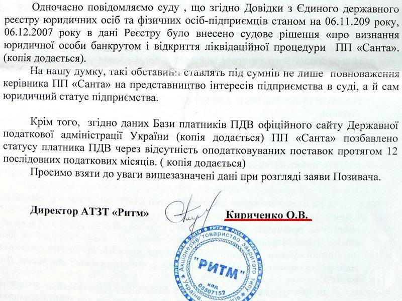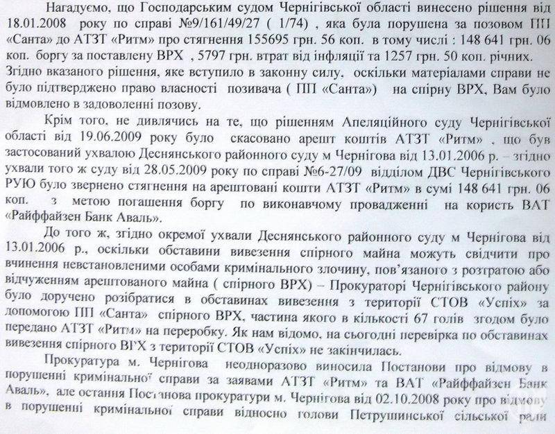 Еще раз отмечаю, каждое слово я могу подтвердить документально. Я уверен, АТЗТ «Ритм» просто использует все хитрости только для того, чтобы не отдавать деньги. Каждому здравомыслящему человеку ситуация понятна. АТЗТ «Ритм» должен отдать деньги ПП «Санта». Дальше эти деньги должны попасть в с.Петрушин. А мы уже здесь со всеми необходимыми органами разберемся, чьи это деньги. А то в последнее время развелось очень много «господ», которые делят чужие деньги. Спрашивают, с какой беды АТЗТ «Ритм» лезет в дела в с.Петрушин? Дело АТЗТ «Ритм» простое, получили скот - рассчитайтесь. Ну и напоследок, прошу на будущее автора статьи опираться только на факты, а не на чьи-то домыслы.