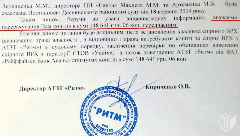 7. «Банк, пытаясь вернуть хотя бы часть денег, предоставленных в кредит, передает дело на рассмотрение суда. В результате средства на счете «Ритма», предназначенные для оплаты спорных коров, заморожены в интересах банка». Удивляет нас автор с каждой фразой. Как это можно заморозить средства в чью-то пользу? Зачем же тогда замораживать? Кроме того, хозяйственным судом Чернигова установлено, что СТОВ «Успех» не имеет никакого отношения к этому скоту, а значит что и банк «Аваль» тоже не может никоим образом претендовать на эти средства. Также в мире решения суда эта фраза выглядит совсем бессмысленной - «также судом признан факт несанкционированного вывоза имущества с территории предприятия СТОВ «Успех» с помощью ПП «Санта». Ведь это имущество было арестовано за долги перед банком».
