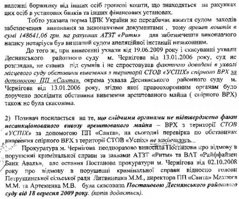 6. «Уголовное дело прокуратура открыть отказались, как часто у нас бывает милиция передает прокуратуре, а прокуратура милиции. . . В результате обстоятельства вывоз арестованного имущества не установлены и до сих пор». Все обстоятельства установлены. Виновная сторона найдена, это СТОВ «Успех». Не нужно читателей вводить в заблуждение.