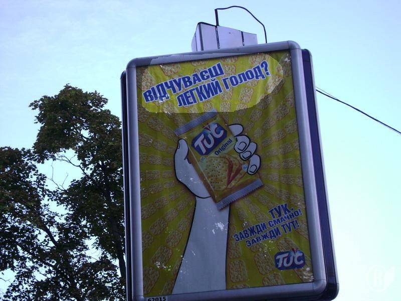 На этом с двух сторон – реклама какой-то партии, а на третьей – реклама какого-то пакетика с «фаст-фудом».