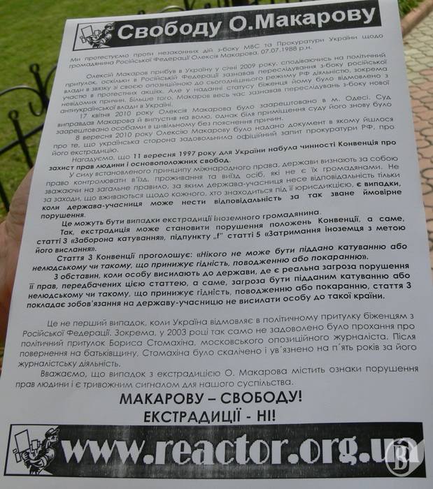 Вони тримали великий банер «Свободу Олексію Макарову!», засуджуючи практику видачі Росії її громадян, які зазнають на батьківщині тортур і переслідувань за свою політичну діяльність.
