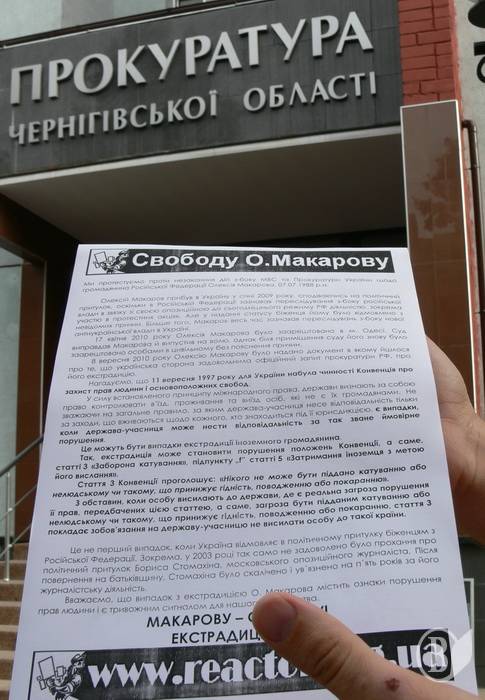 17 вересня представники ВО «Свобода» «Автономного спротиву» і небайдужі чернігівці пікетували приміщення прокуратури Чернігівської області, вимагаючи не допустити екстрадиції в РФ політв’язня Олексія Макарова.