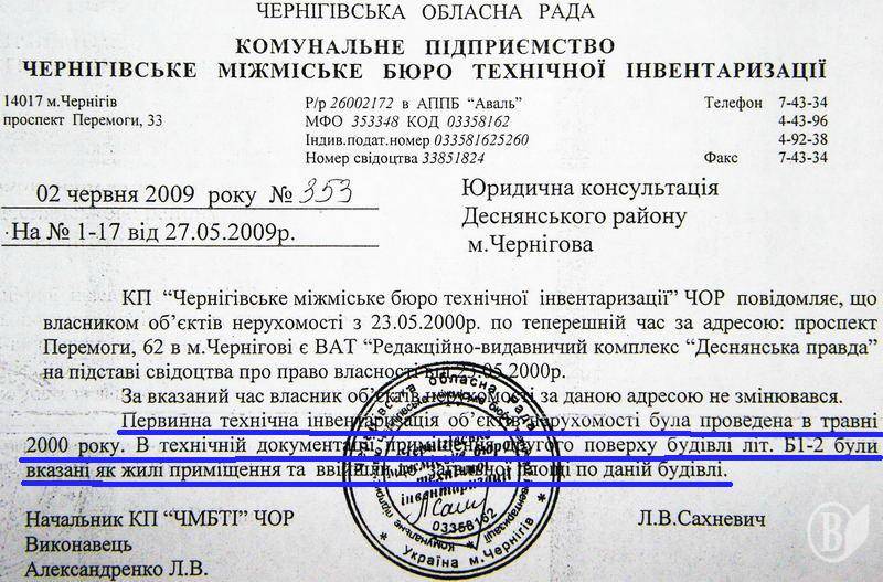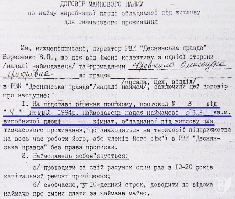 При этом в договоре найма «производственной площади, оборудованной под жилищную», читаем: «на основании решения профкома, протокол №3 от 4 июля 1994 года сьёмщик предоставляет нанимателю. . . ». Подпись – директор РВК «Деснянская правда» В. П. Борисенко.