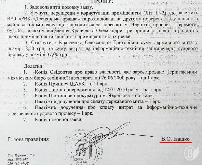 После отказа в удовлетворении «просьбы» руководства относительно выселения, которое поступило через юридический отдел и профсоюз, состоялась встреча «на ковре» с председателем ОАО РВК «Деснянская правда» Владимиром Ивашко, где он уже лично «просил» освободить помещение.
