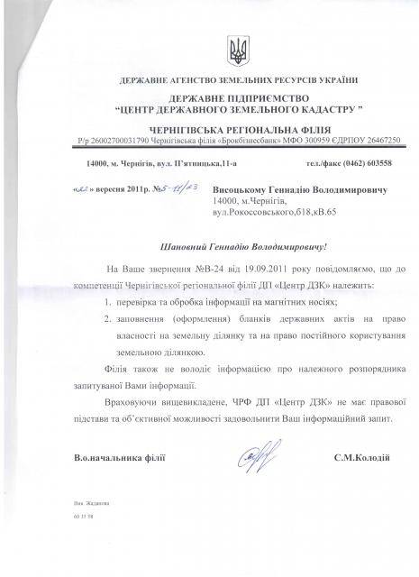 Не володіють інформацією про вільні земельні ділянки і у Державному підприємстві «Центр державного земельного кадастру», - повідомили в чернігівській філії. Окрім того, що вони не володіють інформацією, так вони ще й на знають, хто нею володіє!