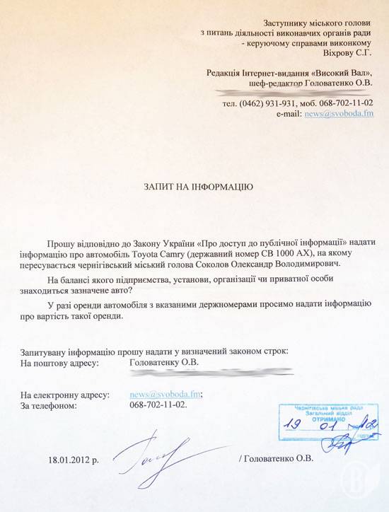 Як повідомляв «Високий Вал», перебуваючи на посаді мера, Олександр Соколов у 2002-2006 роках орендував автомобіль цієї ж марки за 12 гривень на рік у «Чернігівської ТЕЦ».