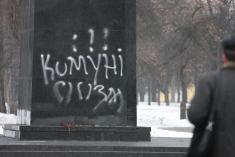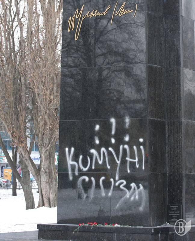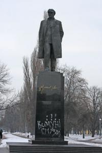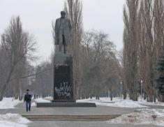 Ніч з лютого на березень принесла пам’ятнику Володимиру Ульянову (Леніну) нові неприємності. Його обписали вдруге після реставрації.
