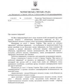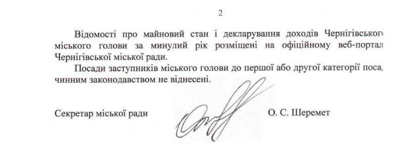 І тільки 17 квітня, з порушенням всіх термінів, Чернігівська міська рада надіслала відповідь за підписом секретаря міськради Олега Шеремета з відмовою надати копії декларацій Чернігівського міського голови та його заступників.