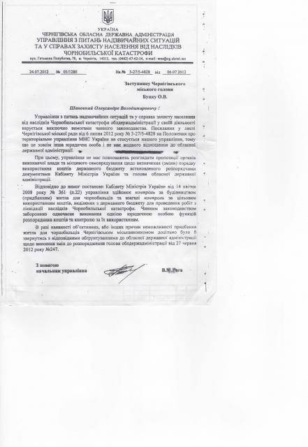 Начальник управління з питань надзвичайних ситуацій та у справах захисту населення від наслідків Чорнобильської катастрофи В’ячеслав Рига стверджує, що управління має контролювати придбання житла та цільове використання коштів державного бюджету. Бо чинне законодавство забороняє одній юридичній особі одночасно виконувати функції і розпорядника коштів і контролювати за їх використанням.