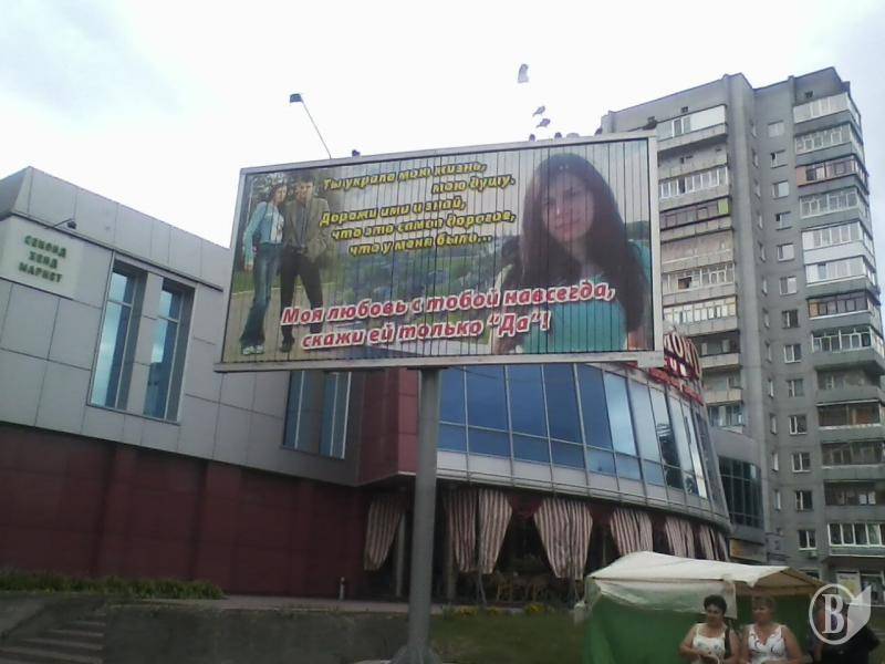 Так, на щиті біля нічного клубу "Diamond" ви можете побачити сюжет "Не хочу учиться, а хочу жениться". На щиті - двоє дівчат, одна з них - ще (чи вже) непарована, і напис російською "Ты украла мою жизнь, мою душу..." і далі за текстом.