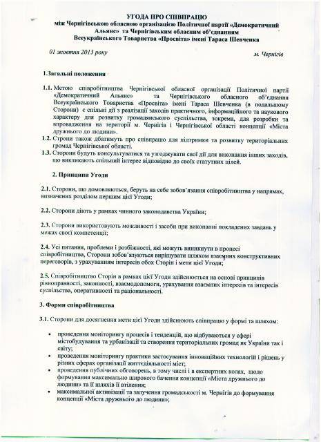 Две организации ставят целью наладить сотрудничество в развитии гражданского общества на Черниговщине - в частности, в Соглашении идет речь об участии в развитии территориальных общин области, формирования и реализации концепции «Города, дружественного людям».