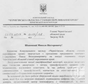 Колектив Чернігівської обласної станції переливання крові виступив з відкритим зверненням до голови обласної ради Миколи Звєрєва, у якому просить зберегти на своїй посаді головного лікаря станції Павла Герасименка.