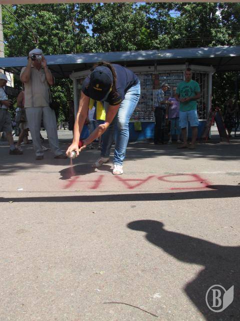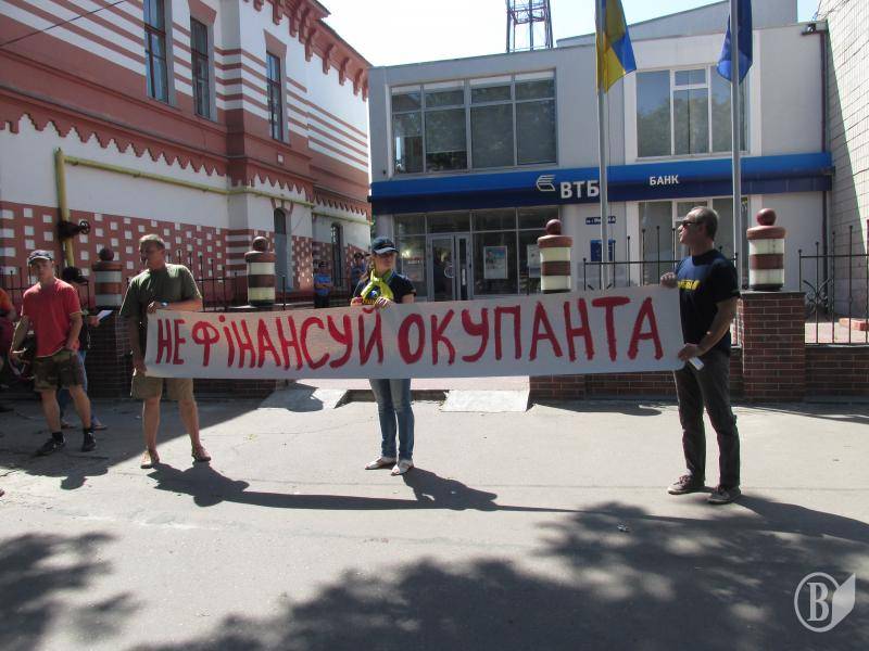 Около двух десятков черниговцев сегодня пикетировали отделения одного из ведущих русских банков «ВТБ». Акция происходила под лозунгом «Русское убивает». Под стенами учреждения они красной краской написали «Банк оккупанта».