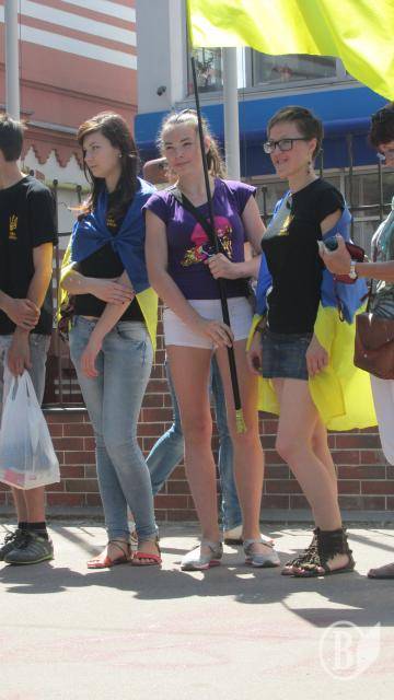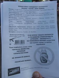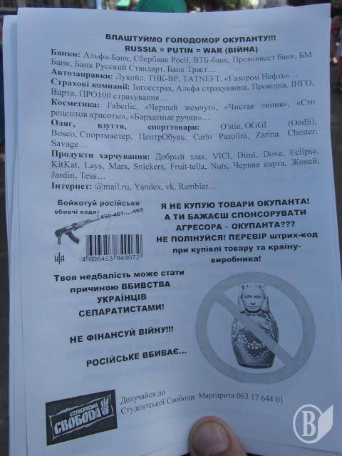 Черниговцам митингующие раздавали листовки с перечнем русских товаров, которые продаются в Украине. Руководитель городской организации «Студенческой Свободы» Маргарита Омеляненко рассказывает: бойкот русского приобрел значительное распространение и уже приносит результат.