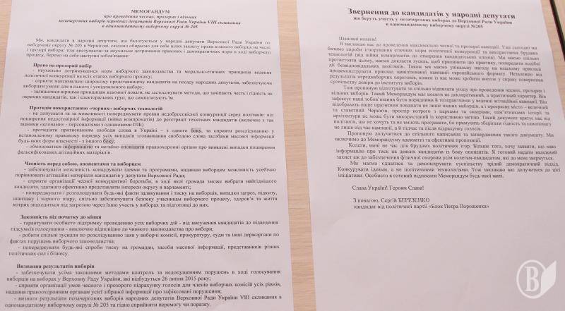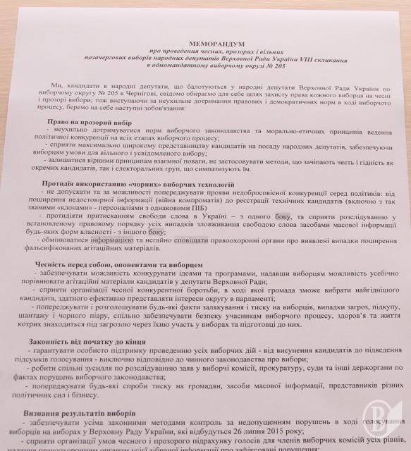 Також на прес-конференції було представлено проект Меморандуму про проведення чесних, прозорих і вільних позачергових виборів народних депутатів Верховної Ради України VIII скликання в одномандатному виборчому окрузі № 205.