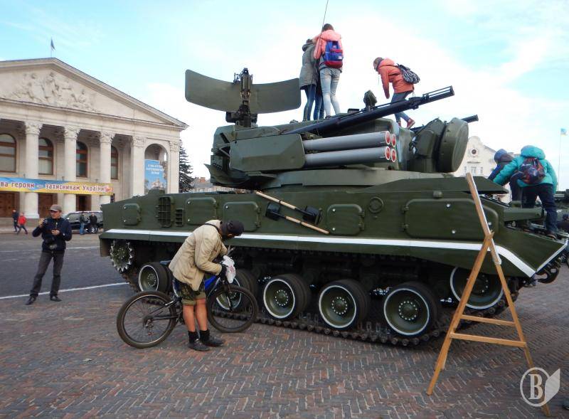На площі було кілька броньованих машин для виконання різних бойових завдань. Була й одна гармата, до якої найлегше було дістатися усім, навіть дівчаткам.
