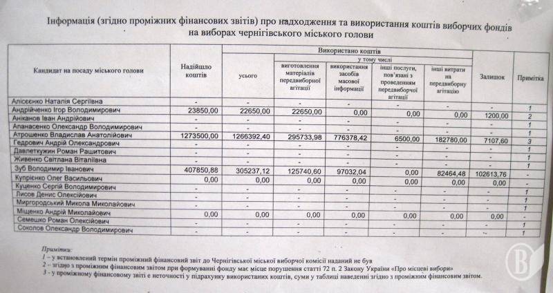 Згідно поданих до міськвиборчкому проміжних звітів, найбільше грошей назбирали та витратили осередки «Нашого краю», «Батьківщини» та Радикальної партії О. Ляшка та такі претенденти на «мерську булаву», як В. Атрошенко, В. Зуб та С. Живенко.