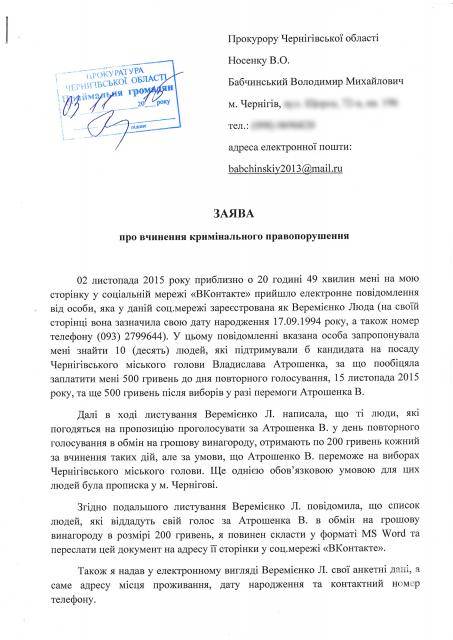 Зокрема, Бабчинський повідомив, що 2 листопада на його сторінку в соцмережі ВКонтакті прийшло повідомлення від громадянки, зареєстрованої як Люда Веремієнко. Вона запропонувала знайти 10 осіб, готових проголосувати за Атрошенка.