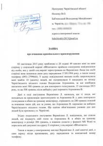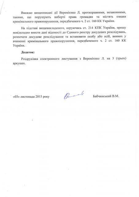 У заяві також йдеться, що Веремієнко попросила скласти список людей, готових продати свій голос за Атрошенка, і переслати цей файл на її сторінку в соцмережі ВКонтакте. «Вважаю дії Веремієнко протиправними, незаконними, такими, що порушують виборчі права громадян та містять ознаки кримінального правопорушення, передбаченого частиною 2 статті 160 КК України», - йдеться в документі.