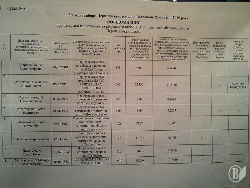 Докладніше про результати першого туру виборів мера Чернігова можна дізнатися з фото з копії протоколу, що подані нижче.