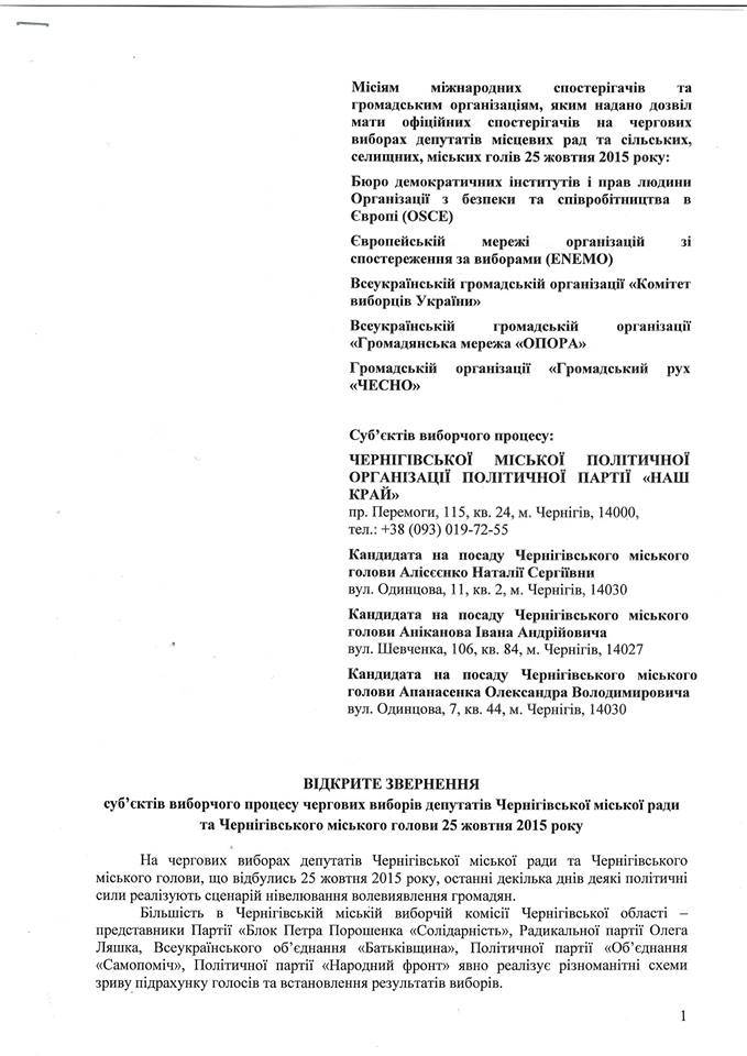 Через загрозу зриву виборів та підкупу виборців Чернігівська міська партійна організація політичної партії «Наш Край», кандидати на посаду мера Наталія Алісєєнко , Іван Аніканов, Олександр Апанасенко оприлюднили відкрите звернення до міжнародних та українських спостерігачів, громадських організацій.