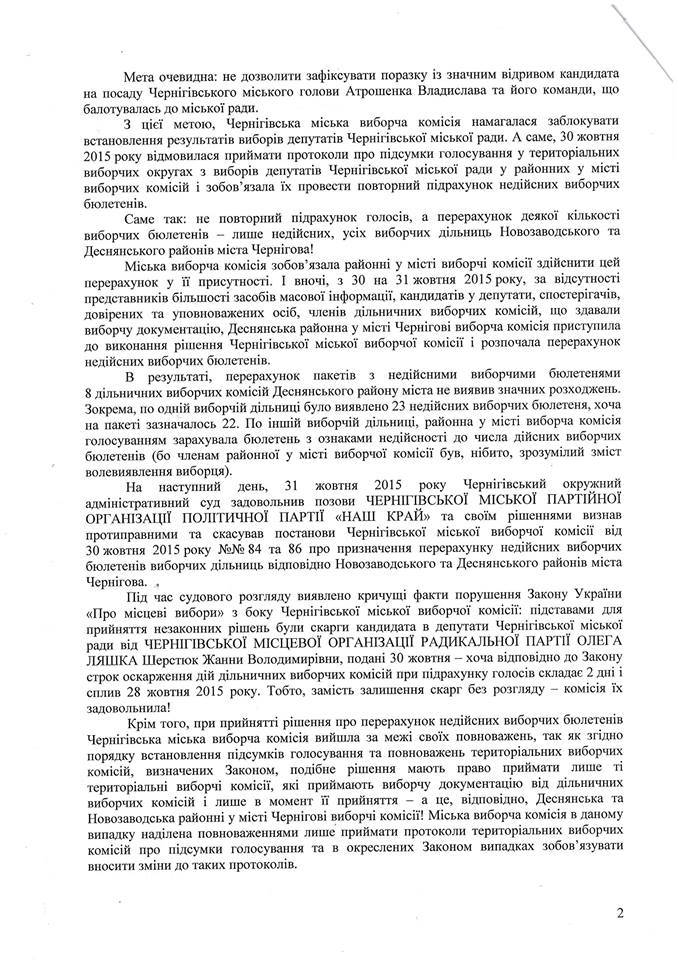 Чернігівська організації «Нашого краю» подала на комісію в суд. Він визнав дії комісії протиправними та припинив перерахунок бюлетенів.