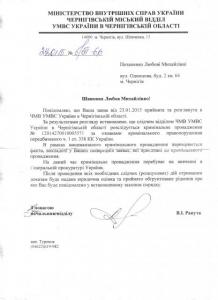Однако новость выдалась мне настолько фантастической, что я запросила ее письменного подтверждения. Вскоре поступило письмо, подготовленное старшим следователем Светланой Туренок, за подписью тогдашнего начальника городской милиции Владимира Рапуты: «На данное время уголовное производство находится на изучении в Генеральной прокуратуре Украины». Нет претензий. Как говорят в Чернигове – «чин-чинарем». ». И только впоследствии просветлело: начальника грубо «подставили» подчиненные.