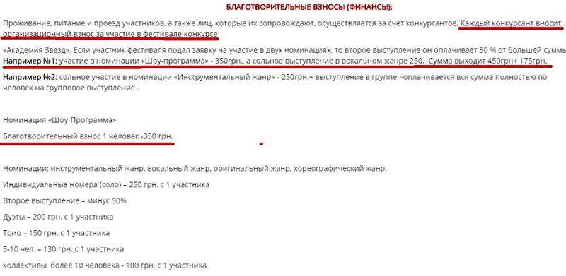 навіщо з дітей-учасників цього фестивалю вимагались і збирались організаційні внески, де фігурували чималенькі (як для "благодійних" внесків) суми? Якщо всі організаційні витрати були профінансовані з міського бюджету від оренди залу до статуеток переможцям. Чи проект реалізується за принципом «Вумне теля у двох мамок ссе!»?